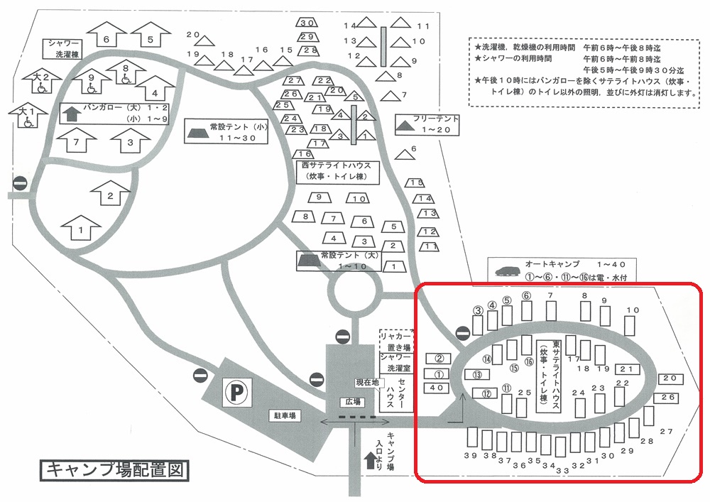・オートキャンプ場は40区画あり、①~⑥及び⑪~⑯のサイトは電源と水道がついています。
