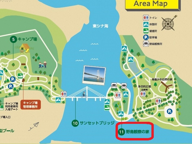 野鳥観察の家は,公園のほぼ中央部を東シナ海に注ぐ万之瀬川の河口,中之島にあります。河口部には豊かな自然が残されていることから野鳥の楽園となっており,絶滅危惧種に指定されている 「クロツラヘラサギ」の越冬地としても有名です。