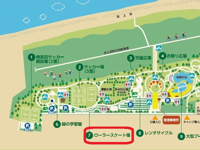 | コースの案内 ●ビギナーリンク 初心者を対象とした平坦なリンクで,広さは縦50m,横30mあります。 ●スピードコース 起伏に富んだ555mの周回コースとなっており,中級者を対象としています。 ●ジャンプコート インラインスケートやBMX,スケートボードが楽しめる上級者コースです。 |